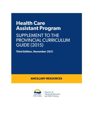 The Health Care Assistant Program: Supplement to the Provincial Curriculum Guide (2015), Third Edition, November 2021 has been updated to support the delivery and assessment of the required learning outcomes and course content set out in the Health Care Assistant Program Provincial Curriculum (2015).